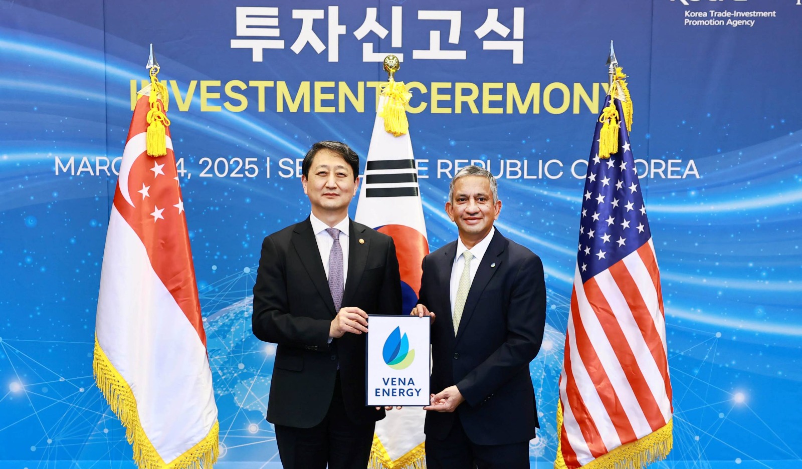[Seoul, Korea; 25 March 2025] Vena Energy, a leading green energy solution provider in the Asia-Pacific region, has announced a significant investment to accelerate South Korea’s transition to renewable energy and enhance its energy independence. The announcement was made during an Investment Ceremony with the Ministry of Trade, Industry and Energy (MOTIE) and the Korea Trade-Investment Promotion Agency (KOTRA).